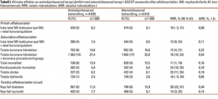 ASCOTs huvudresultat var att amlodipinbaserad terapi var bättre än atenololbaserad vad gäller totalmortalitet och ett flertal kardiovaskulära utfallsvariabler, även om den absoluta riskreduktionen var liten (Tabell I). Eftersom ingen placeboarm fanns med, kan resultaten tolkas antingen som att amlodipinbaserad behandling hade fördelar eller som att atenololbaserad terapi hade nackdelar. Det finns dock vissa belägg för att atenolol kan ha en ganska svag kardioprotektiv effekt enligt en aktuell metaanalys [2].