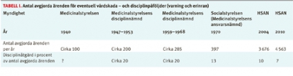 År 1940, innan någon egentlig disciplinnämnd fanns, behandlade Medicinalstyrelsen cirka 100 ärenden [5]. Det framgår inte av rapporten hur många fall som ledde till någon disciplinär åtgärd. Från 1947, då den första nämnden bildades, och fram till 2010 behandlades ett hela tiden stigande antal disciplinärenden (tabell I), en återspegling av den nästan explosionsartade utvecklingen av antal läkare och vårdtillfällen. 1940 var antalet läkare i Sverige drygt 3 000 och år 2010 cirka 34 000. Frekvensen fällande utslag i förhållande till antal anmälningar minskar över tid och tyder på en ökad anmälningsbenägenhet.