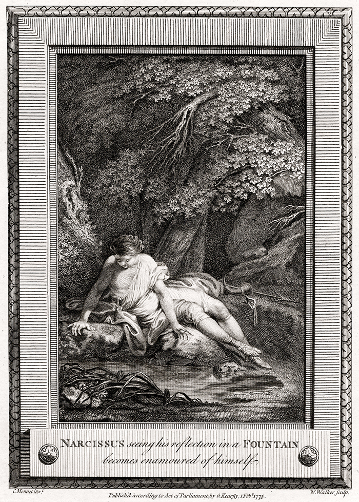 Unge, vackre Narcissus har ingen användning för ungdomens källa – möjligen bara för dess yta som speglar bilden av den han är förälskad i. (Kopparstick från 1775, London.) Foto: Heritage Image/IBL