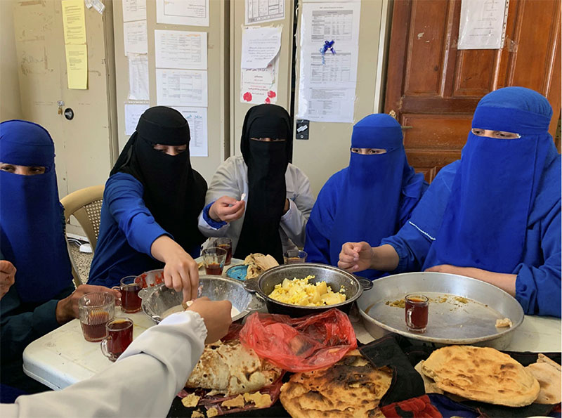 Frukost med kollegor på förlossningsavdelningen på sjukhuset i Khamer i Jemen. En fin kvinnogemenskap inom slutna väggar, enligt skribenten. Foto: Charlotta Grunewald