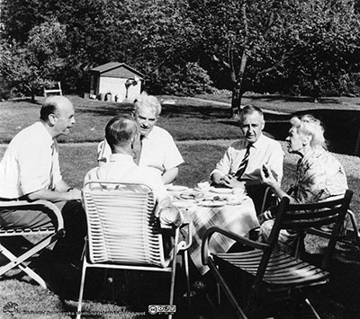 Styrelsen för John och Augusta Perssons stiftelse sammanträder i donatorernas trädgård i mitten av 1960-talet. Fr v: C G Ahlström, John Persson, Rune Tersman, Eric Sundmark och Augusta Persson. Foto: Kurt Lidén