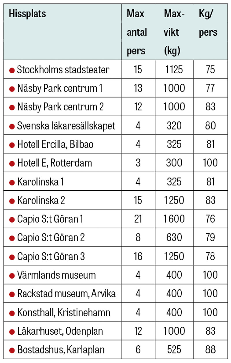 Men avläser man texten på hissdörrar runt i världen är spridningen betydande. Tabellen återger antalet tillåtna resenärer och kommer från klart osystematiska personliga noteringar i Sverige och utomlands. Av tabellen här bredvid framgår att holländare och värmlänningar får vara mycket tyngre för att få åka med hiss. Teaterbesökare förväntas hålla medelvikt. Karolinska och S:t Görans sjukhus håller sig med skilda viktnormer, och i Näsby Parks galleria utanför Stockholm får man väga 6 kg mer i den ena hissen än i den andra. På övre Östermalm i Stockholm får resenären vara rejält tung för att få åka med. Det är paradoxalt, eftersom alla epidemiologiska data talar för att övervikt är ovanligare i välutbildade högre sociala skikt.