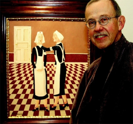 En intensiv och fantasieggande kollektion målningar och träskulpturer av Tor-Göran Henriksson från Uppsala – plastikkirurg till yrket och konstnär på fritiden – visades nyligen på galleri Svenska Bilder i Stockholm. I linje med tidigare utställningar som Henriksson haft var flertalet motiv hämtade från uppsaliensisk sjukhusmiljö, ofta med fokus på konstnärens favorittema: stramt uniformerade sjuksköterskor i gammaldags blåvitt.