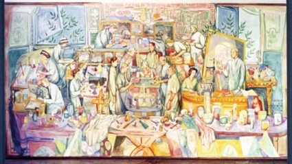 Monumentalmålningen – 18 kvadratmeter! – på »gamla patologen« vid Karolinska institutet har en intressant historia. Den var ett beställningsarbete som patologiprofessor Folke Henschen gav till sin svärson Peter Weiss och visar ett myller av människor på temat »Institutionen arbetar«, dvs professorn själv och hans medarbetare.