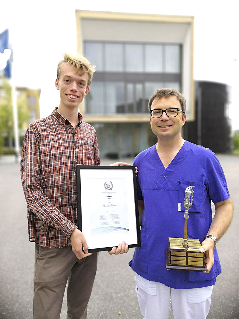 Henrik Fagman (t h), universitetslektor i patologi och klinisk anatomi, är läkarstudenternas favorit 2018. Han tar emot vandringspriset »Pedalen« från Karl Kilbo Edlund (t v), ordförande vid Sahlgrenska akademins studentkår. Foto: Åsa Loodus