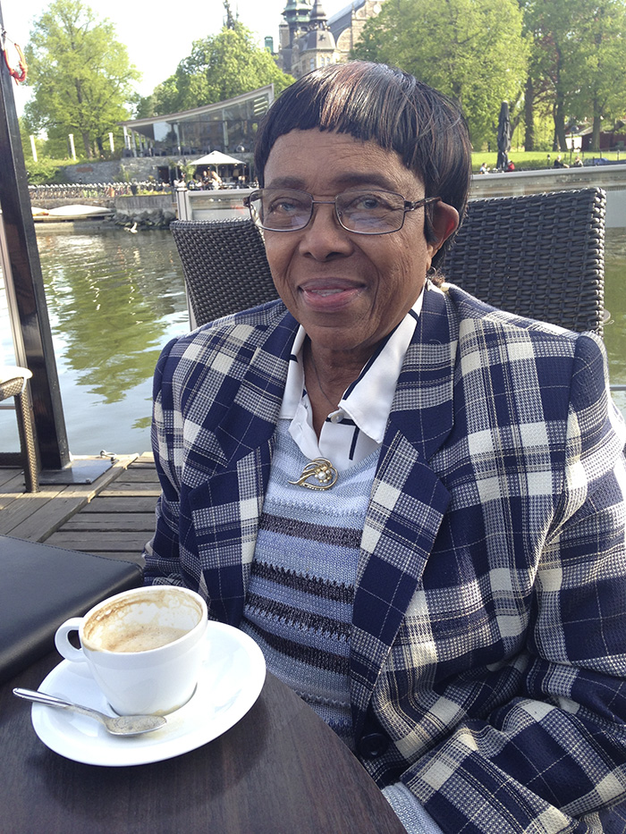 Marina Xaba-Mokoena, lungspecialist, professor, f d minister, avnjuter sin cappuccino nära Djurgårdsbron i Stockholm. Hon är på besök i Sverige för en återträff med kurskamrater från läkarutbildningen 1966. Foto: Gabor Hont
