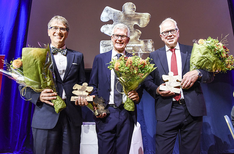 Glädje på Grand Hotel, Stockholm. Ortopedspecialisterna (fr v) Magnus Karlsson, Harald Roos och Jón Karlsson, redaktörer bakom läroboken »Ortopedi – patofysiologi, sjukdomar och trauma hos barn och vuxna«, tog emot läromedelsförlaget Studentlitteraturs pris för årets bästa kurslitteratur för universitet och högskolor.