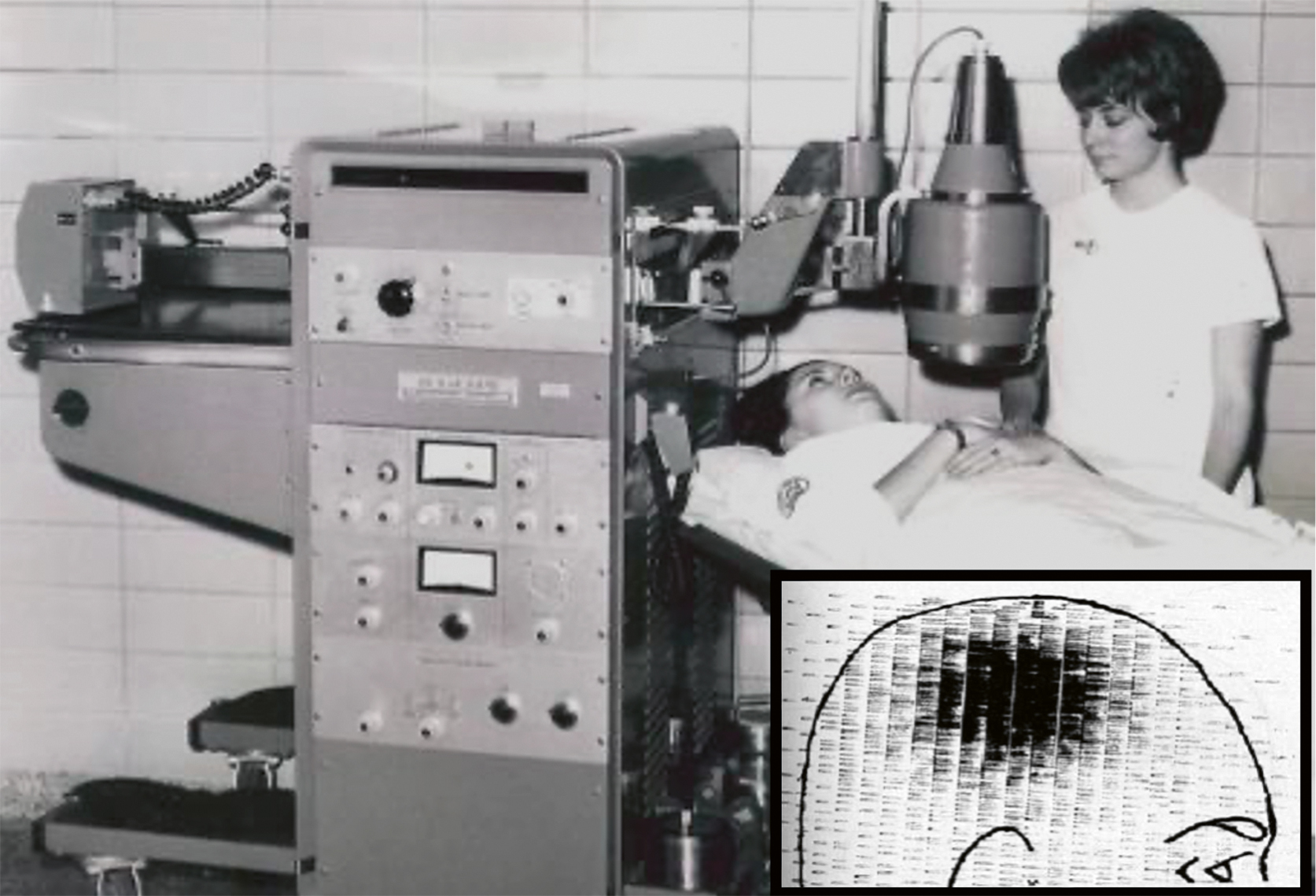 Figur 1. Rektilinjär skanner (skintigraf) från 1950-talet. Den stora bilden visar utrustningen där detektorn som sveper över patienten hänger vertikalt. Den infällda bilden visar upptag i en hjärnförändring. Anatomiska referenser är inritade i efterhand. (Bild: okänt ursprung)