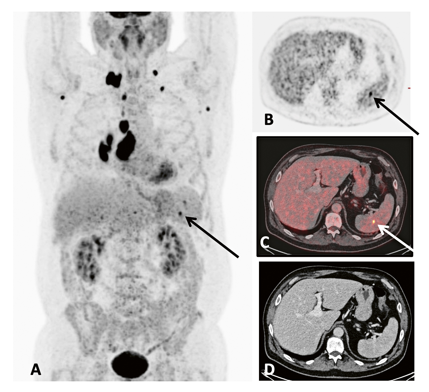 Figur 2. PET/DT-undersökning med 18F-fluorodeoxiglukos av en patient med malignt lymfom. A. PET-registreringen visar kraftigt spårämnesupptag i multipla tumörhärdar i torax och ett litet, distinkt tumörupptag i mjälten (pil). B–D utgör tvärsnitt i samma nivå genom mjältupptaget. Upptaget är tydligt (pil) vid PET-registreringen (B) och vid den kombinerade PET/DT-registreringen (C). Snittet från DT-registreringen (D) visar inget anatomiskt avvikande. PET-undersökningen har kunnat påvisa tumörengagement kaudalt om diafragma, vilket påverkar stadieindelningen av tumörsjukdomen. (Bild: Per Grybäck, Karolinska Universitetssjukhuset)