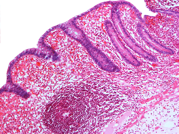 En sjuk blindtarm i mikroskopsperspektiv. Inflammationen underhålls genom invation av immunförsvarets försvarsceller (det mörkröda i bilden). Foto: SPL/IBL