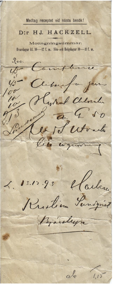 Agneta Durling, psykiater: Receptet var inte så svårtolkat för mig som arbetat som farmaceut. Ingredienserna blandas till ett linement för att användas utvärtes som smärtstillande medel vid neuralgier och reumatisk värk. Kamfer är även bra vid kylskador och klorallhydrat vid klåda.