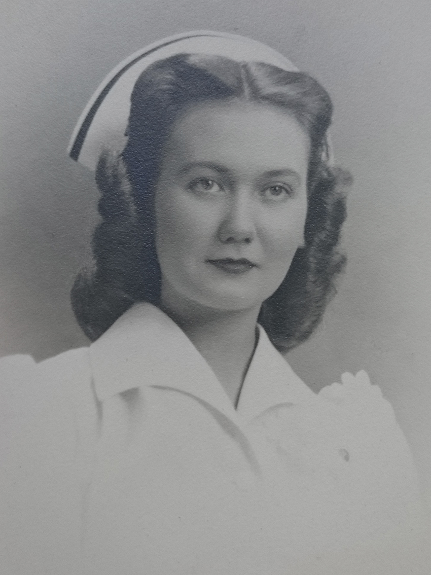 Barbro Tilosius, sjuksköterska på Sahlgrenska sjukhuset i Göteborg 1954-1986. För sin unge släkting Alexander Tilosius, vikarierande underläkare i början av karriären, berättade hon om en typisk arbetsdag i 1950-talets sjukvård. Foto: Privat