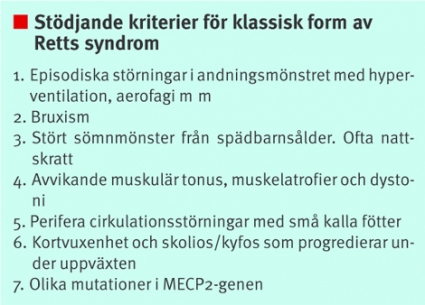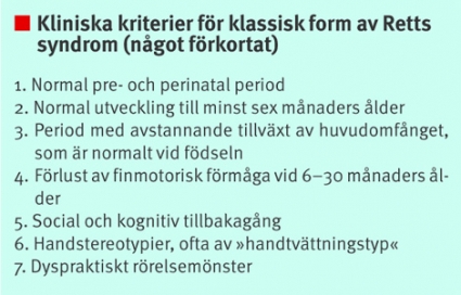 I Sverige var det dr Ingegerd Witt-Engerström som under professor Hagbergs ledning skrev en rad artiklar om Retts syndrom, vilka ledde fram till hennes avhandling [4]. Hon tog också under 1990-talet initiativet till Rett Center i Östersund. Från Skottland, Japan och Australien kom artiklar i snabb följd, och