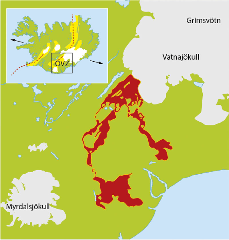 Den östra vulkanzonen (ÖVZ) ligger mellan Myrdalsjökull och Grímsvötn på Vatnajökull. Lavan från Lakivulkanen är markerad med rött. De aktiva vulkansystemen på Island är markerade i gult. Plattgränsen följer den röda streckade linjen. Spridningsriktningarna för de eurasiska och nordatlantiska