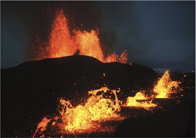 Vulkanutbrott på Island – liknande Lakiutbrottet – ägde rum mellan 1975 och 1984 vid Kraflavulkanen. Här syns lavafontäner under utbrottet den