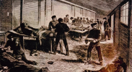 Det mest intensiva medicinska arbetet skedde vid ambulansen, vilket vid denna tid innefattade den rörliga sjukvården i fält. En sårad soldat togs från slagfältet först med bår, sedan någon kilometer med vagn till mobila fältsjukhus där den första vården utfördes. Den svenske medicinstudenten Nils Nyström har synpunkter på den denna transport: »…flyttandet på och ifrån de höga vagnarna vid svåra lesioner är ytterst svår, och i högsta grad plågsam för de sårade« [7]. Granat- och gevärssår var vanliga skador. Bataljonsläkare Edward Edholm konstaterade att »förstörelsens konst tagit ett jättesteg framåt under det att återställandets konst, kirurgin, står qvar på samma punkt« [8]. Främmande kroppar som kulor avlägsnades, och i såren lades sedan så kallad charpi. Detta var nystan av linnetråd som producerats och sänts in av civila. Att repa charpi var vid denna tid ett vanligt »högreståndspyssel«. Under fransk-tyska kriget 1870–1871 sände det svenska kungaparet ca 90 kilo repat gammalt linne som humanitärt bistånd [9]. Syftet var att framkalla varbildning, vilket sedan antiken ansetts som gott och berömvärt, »pus bonum et laudabile« [10]. Om kraftig blödning förelåg lades både fnösksvamp och kompress före omlindning [11].