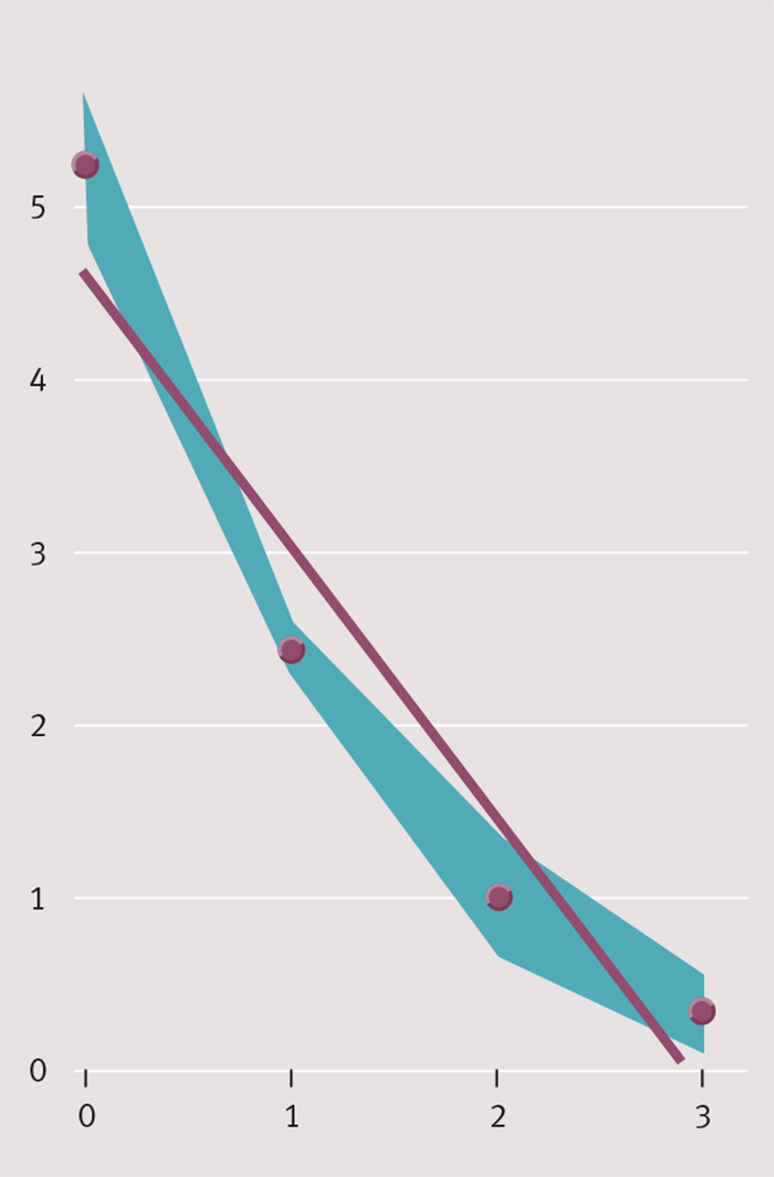 Figur 1. Inaktivering av poliovirus med 0,006 M formaldehyd vid 25 °C. Det gröna fältet representerar medelvärden för 15 experiment med konfidensintervallet markerat. Heldragen linje anger bäst passande regressionslinje.