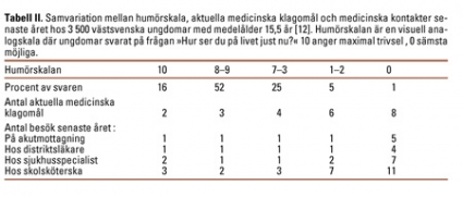 Praktiskt medicinskt är det viktigt att veta vad ungdomar söker för. Ungdomar är storkonsumenter inom området reproduktiv hälsa. De har också hög frekvens av skador till följd av trafikolyckor, idrottsutövning, våld mm. Behovet av psykiatrisk vård är stort. Deras egna medicinska klagomål i en epidemiologisk undersökning framgår av Tabell I [10]. Men viktigt för alla är att förstå samband mellan olika indikationer på ohälsa och att kunna screena för bakomliggande allvarliga problem. Det handlar om att ta en heltäckande anamnes när varningsklockor börjar ringa. En ung person som söker för huvudvärk kanske bara har det problemet. Men en bred anamnes kan visa att vederbörande också är trött, har ont i ryggen, drabbas av upprepade trafikolycksfall och tar sömntabletter varje natt, egna eller andras. Då är det dags att ta ett helhetsgrepp på situationen. Att testa en cigarett som 13-åring kan ses som ett led i normalt experimenterande med olika livsstilar. Men att fortsätta röka om så bara på partyn har en helt annan innebörd. Tabell II och III exemplifierar vad olika signaler kan indikera och visar samvariationen mellan olika ohälsobeteenden och -manifestationer [11, 12].