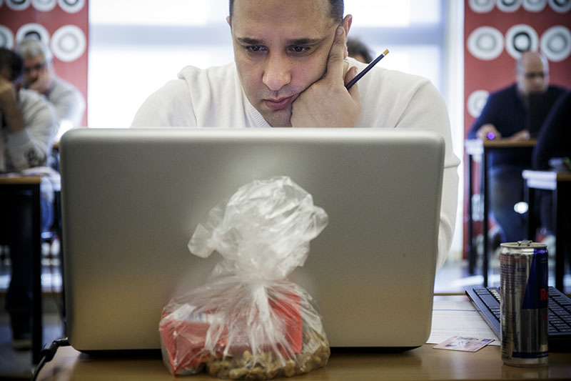 – Första delen av provet har 140 frågor och fem svarsalternativ, varav ett är rätt. Deltagarna har fyra timmar på sig – alltså 1,7 minuter för varje fråga. Vill de även läsa svarsalternativen blir det 30 sekunder för frågan och 30 sekunder per alternativ.