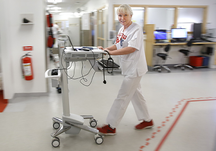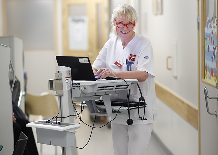 »Kollegorna brukar skoja om att jag går runt med min rullator. När jag går in till patienten har jag all information med mig …«, säger Kerstin Skog Tigerström.