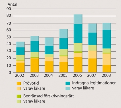 Förra året blev 10 läkare av med legitimationen (18 sjuksköterskor/barnmorskor, 6 tandläkare och 3 övriga) och 16 belades med prövotid (10 sjuksköterskor/barnmorskor och 1 tandläkare). Sex läkare och en tandläkare fick sin förskrivningsrätt begränsad.