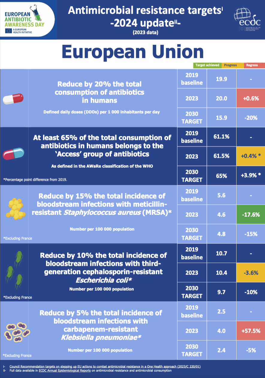 Kampen mot antibiotikaresistens går knackigt inom EU, visar statistik som den europeiska smittskyddsmyndigheten ECDC släppte på måndagen. Bara ett av fem mål som har satts upp till 2030 har uppfyllts, medan två av målen är rödmarkerade i en grafik som myndigheten har tagit fram inför den europeiska antibiotikadagen.