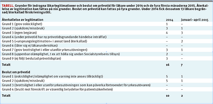 Grunder för indragna läkarlegitimationer och beslut om prövotid för läkare under 2014 och de fyra första månaderna 2015. Återkallelse av legitimation kan fattas på nio grunder. Beslut om prövotid kan fattas på fyra grunder. Under 2014 fick dessutom 13 läkare begränsad/återkallad förskrivningsrätt.
