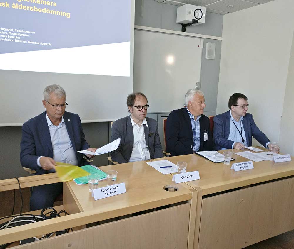 Vid presentationen av den fördjupade studien kring åldersbedömningar med hjälp av magnetkamera medverkade från vänster Lars-Torsten Jansson, Socialstyrelsen, Olle Söder, Karolinska institutet, Johan Sanmartin Berglund, Blekinge tekniska högskola samt Carl-Erik Flodmark, Socialstyrelsen. Foto: Joakim Andersson