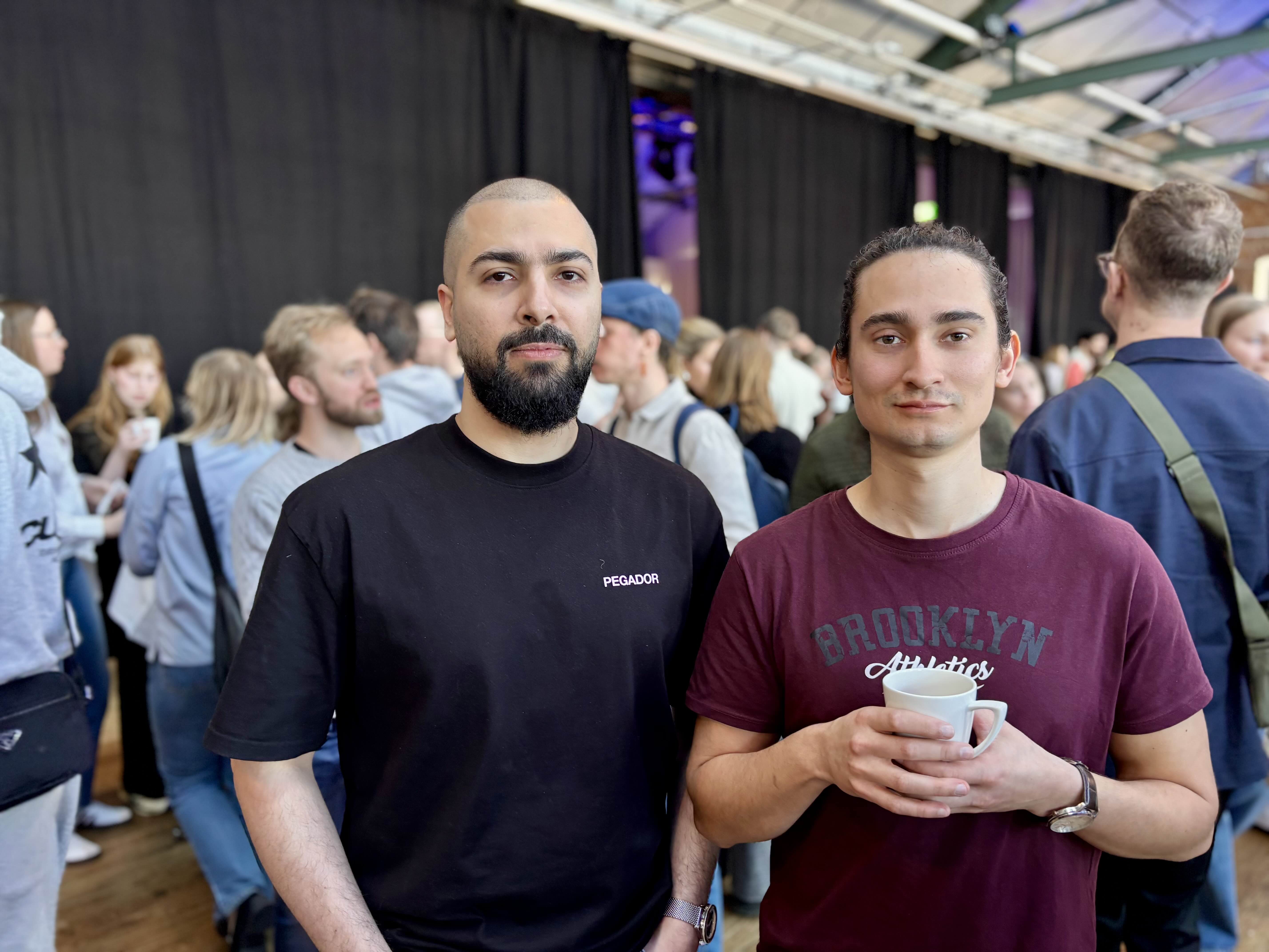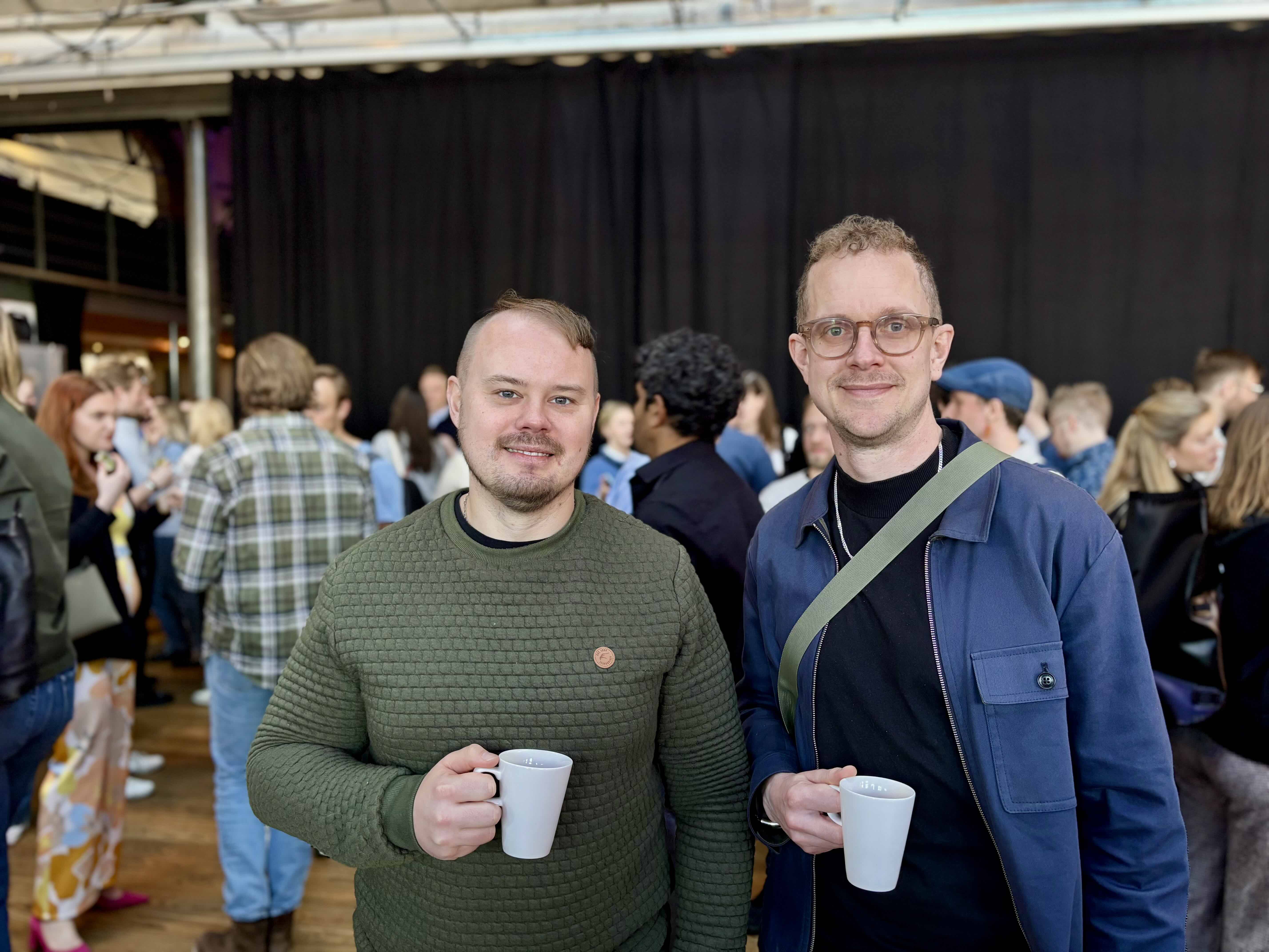AT-läkarna Farouk Omer Fadel och Bamse Lilja minglar med kaffe under en av pauserna. De är positivt överraskade av vad stämman har bjudit på hittills.