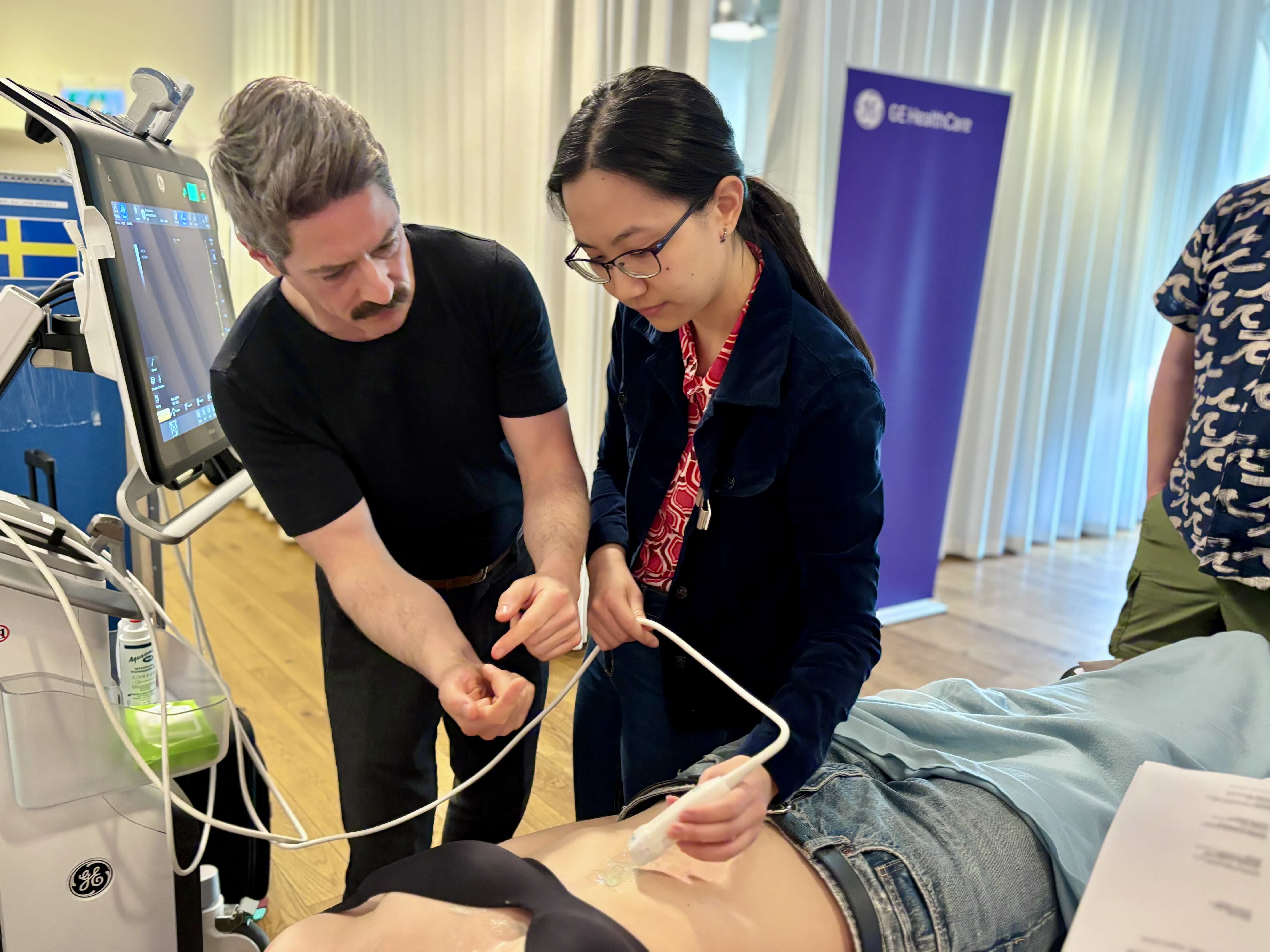 Ludwig Bell, specialist i internmedicin och ST-läkare i kardiologi, instruerar AT-läkaren Victoria Huang vid en av ultraljudsstationerna på »anestesiverkstaden«.