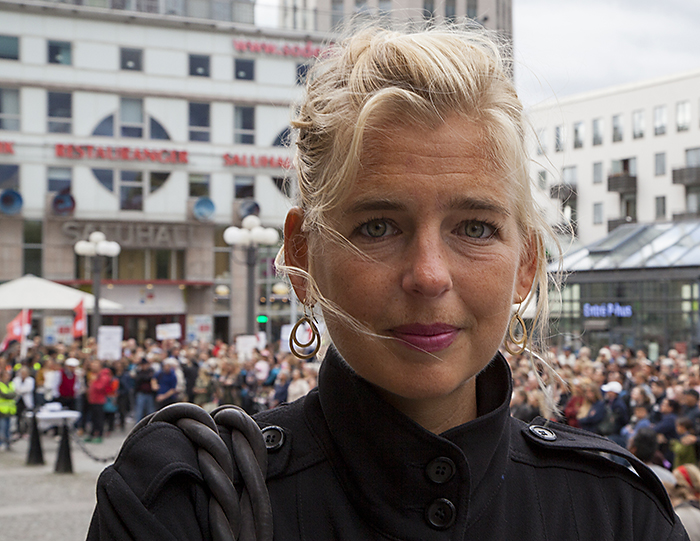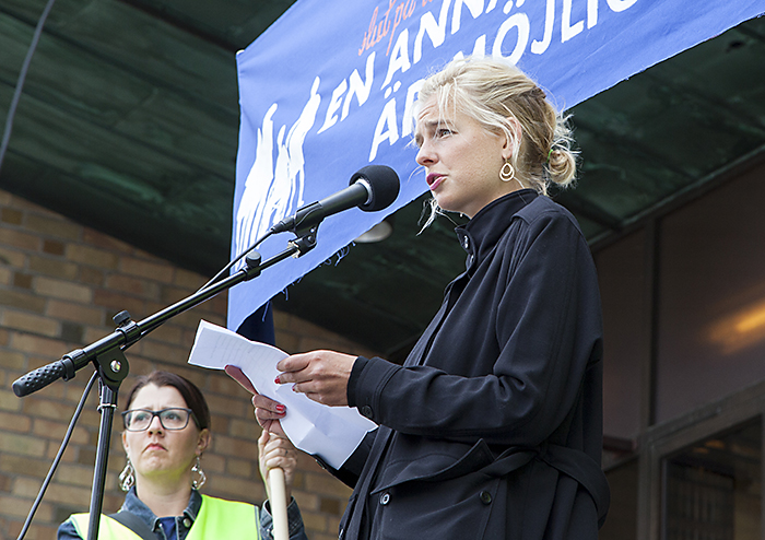 Charlotta Dickman, sjuksköterska och en av de tre initiativtagarna till demonstrationen, inledningstalade på Medborgarplatsen i Stockholm. Foto: Maj-Lis Koivisto