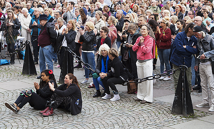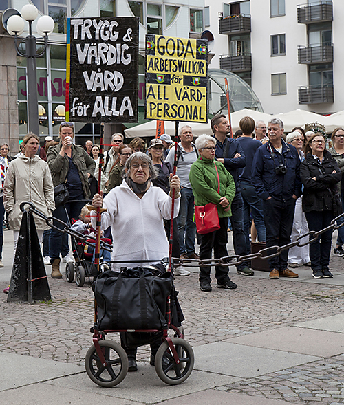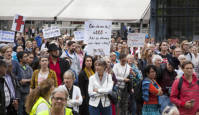 På Medborgarplatsen i Stockholm samlades några hundra demonstranter och lyssnade på företrädare för bland annat Vårdförbundet, Njurförbundet och Blodcancerföreningen. De pratade om kvaliteten i vården, arbetsmiljön, stressen som gör personalen sjuk och en patientsäkerhet som är hotad. Unga Byggare deklarerade sitt stöd för vårdpersonalen.