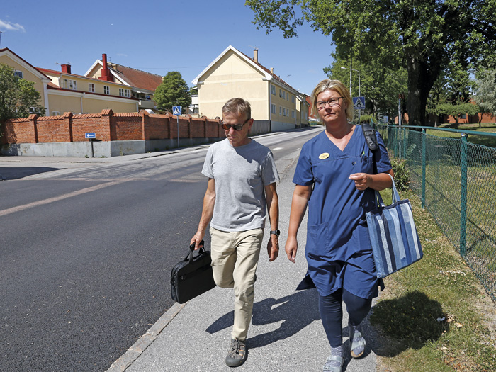 Anders Hansson och sjuksköterskan Carina Ahl på väg hem till en patient i hemsjukvården. Anders Hansson tror att det rent generellt skulle vara en stor fördel om patienter fick tillhöra hemsjukvården baserat på vårdbehov i stället för deras förmåga att ta sig till vårdcentralen. Foto: Åke Karlsson