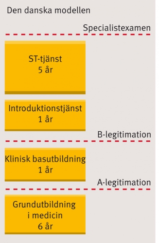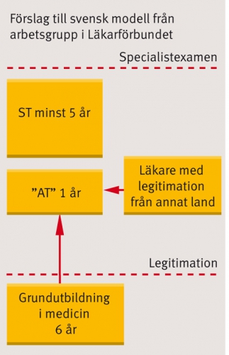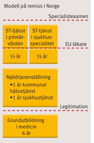 Läkarförbundet håller på att ta fram en policy för yrkesutbildningen, och den arbetsgrupp som jobbar med frågan förordar en liknande modell som i Norge (se grafik). »För oss är det viktiga att det är en tjänst med lön, och inte praktik på slutet av grundutbildningen«, förklarar Heidi Stensmyren, ordförande i arbetsgruppen och förste vice ordförande i Läkarförbundet.