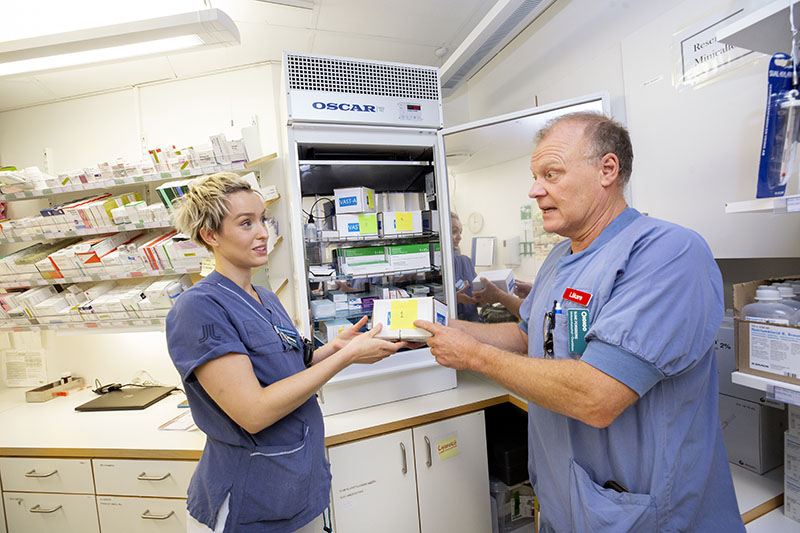 Agnes Buhrman, sjuksköterska, och Sune Forsberg, läkare, tar ut studieläkemedlen ur ett kylskåp på akutmottagningen. »När vår ledningssjuksköterska tar emot hjärtlarmet kommer någon av oss på akuten att hämta läkemedlen och springa med dem till platsen för hjärtstoppet«, säger Agnes Buhrman. Foto: Rickard Kilström