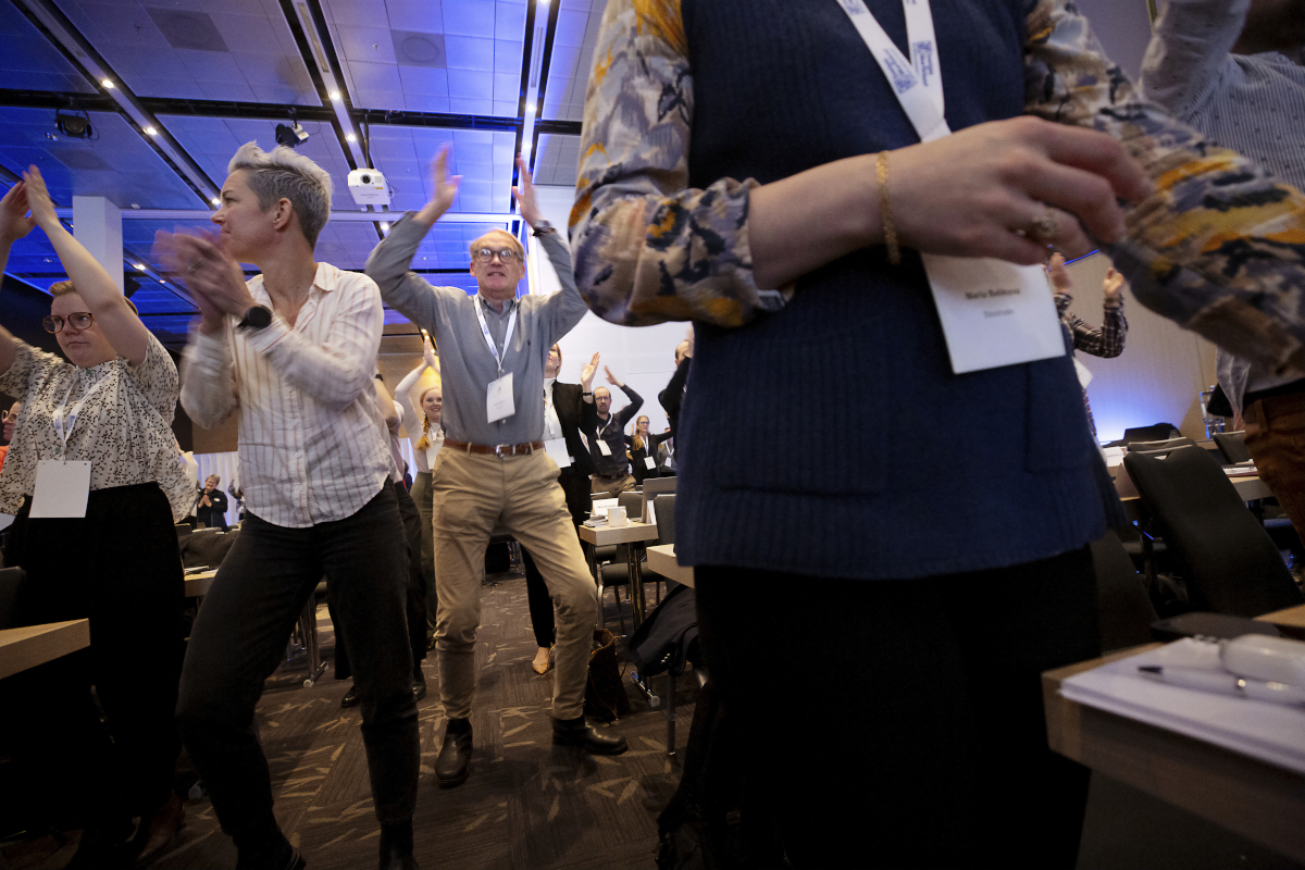 Mingelytan töms på folk när alla strömmar in i möteslokalen. Utanför plockar konferenscentrets personal kaffekoppar. I möteslokalen jobbas det lika hårt, och ord som »SKR«, »läkare« och »Förbundet« som strömmar från podiet.