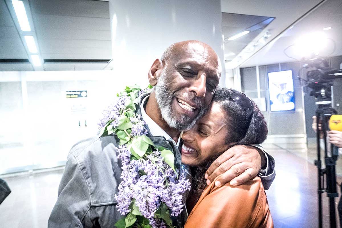Fikru Maru möttes av familj och vänner, bland andra dottern Fikerte Maru, när han anlände till Arlanda flygplats på fredagsmorgonen. Foto: Magnus Hjalmarson Neideman/SvD/TT