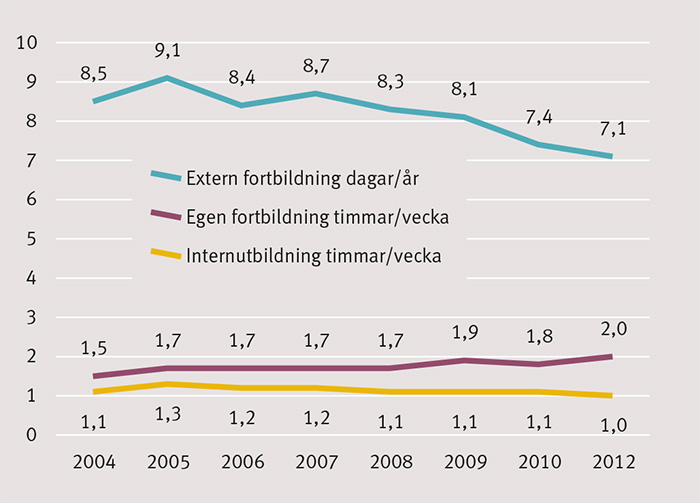 När det gäller internutbildning och egen fortbildning ser man ingen direkt trend; nivån har ända sedan den första enkäten gjordes 2004 legat kring tre timmar i veckan, en timme mindre än Läkarförbundets mål på fyra veckotimmar.