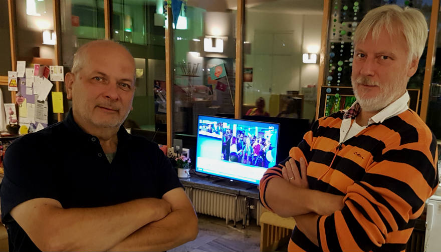 Kirurgen Bengt Ehliar och narkosläkaren Mats Åström följer valresultatet vid Sollefteå sjukhus entré. Foto: Fredrik Mårtensson
