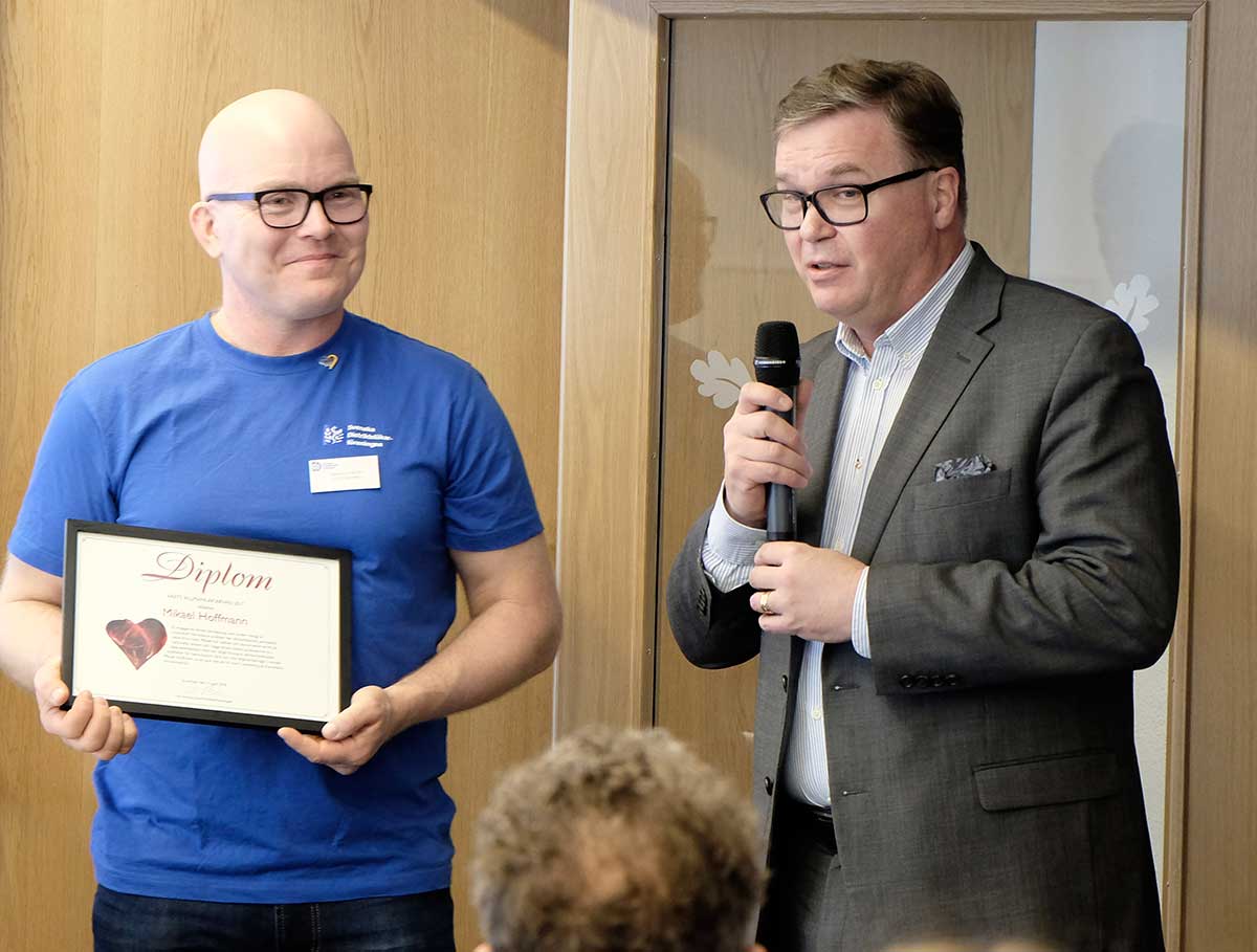 Mikael Hoffmann (till höger) håller tacktal efter utnämningen till Årets allmänläkarvän. Till vänster avgående styrelseledamoten Rikard Lövström. Foto: Joakim Andersson