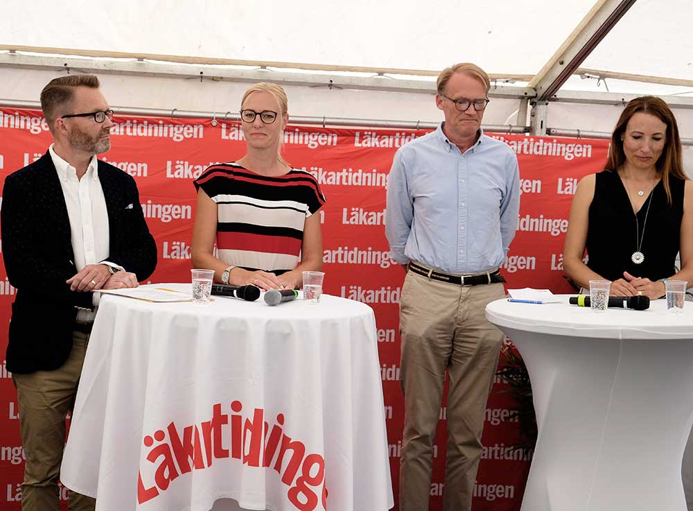 Panelen från vänster: Peter Carpelan (M), personallandstingsråd Stockholms läns landsting, Erika Ullberg (S), oppositionslandstingsråd Stockholms läns landsting, Johan Styrud, ordförande Stockholms läkarförening, Heidi Stensmyren, ordförande Sveriges läkarförbund. Foto: Joakim Andersson