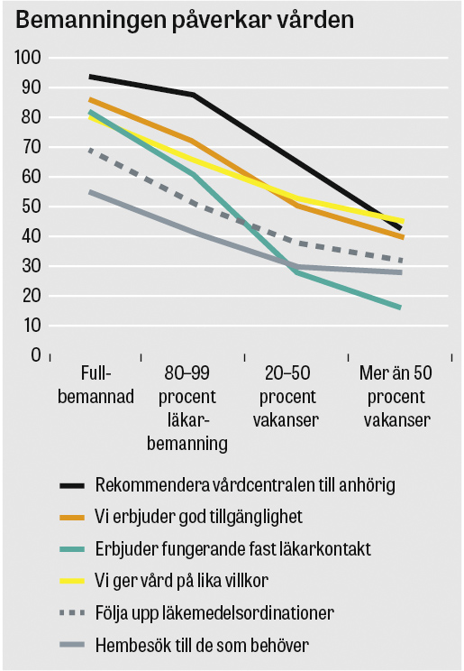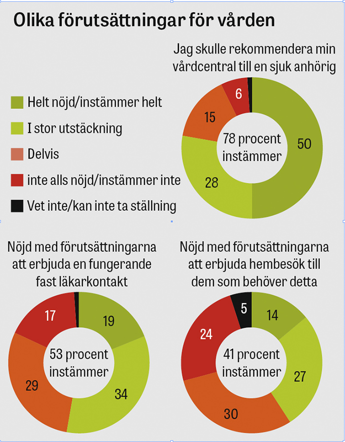 Svaren på frågorna visar att många av läkarna är missnöjda med sina möjligheter att erbjuda god vård. En av fem svarade att de inte kan rekommendera sin vårdcentral till en sjuk anhörig. Bara drygt hälften anser att de kan erbjuda en fungerande fast läkarkontakt, och ungefär lika många är nöjda med sina möjligheter att följa upp patientens läkemedelsordinationer. Endast cirka 40 procent är nöjda med förutsättningarna att kunna erbjuda hembesök.