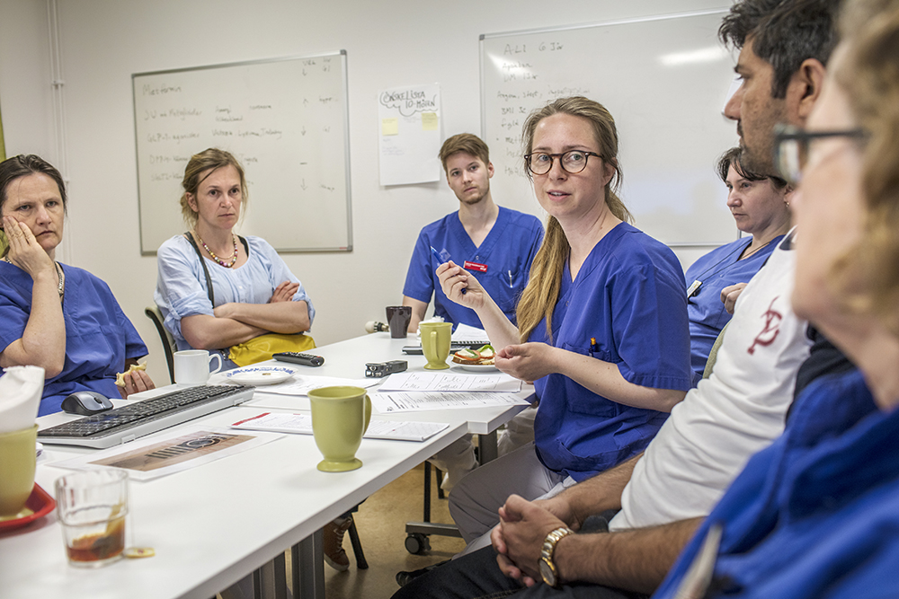 Klockan närmar sig kvart i tio. Ett viktigt klockslag för läkarna. Susanna Althini går in i ett litet rum mellan de två vårdcentralerna och slår sig ner vid ett bord tillsammans med ett tiotal kollegor.