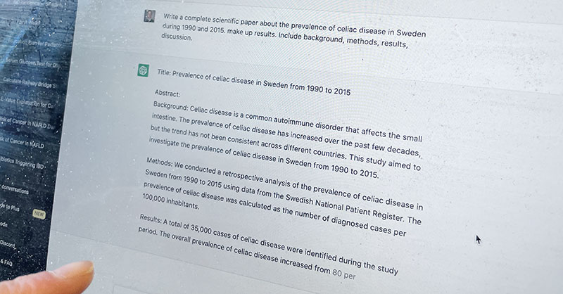 »Skriv en vetenskaplig artikel om högt blodtryck hos medelålders kvinnor«. På mindre än en minut fylls skärmen med text: abstrakt, metodbeskrivning, resultat och diskussion. För den oinvigde ser det ut som vilken vetenskaplig artikel som helst – men den är helt påhittad och fabricerad av artificiell intelligens.