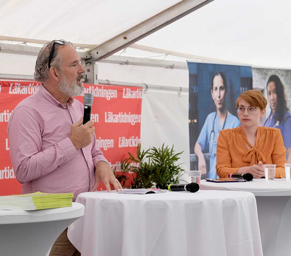 Professor Steven Bachelder och Tora Borén, styrelseledamot i Sylf och seminariets moderator. Foto: Jesper Cederberg