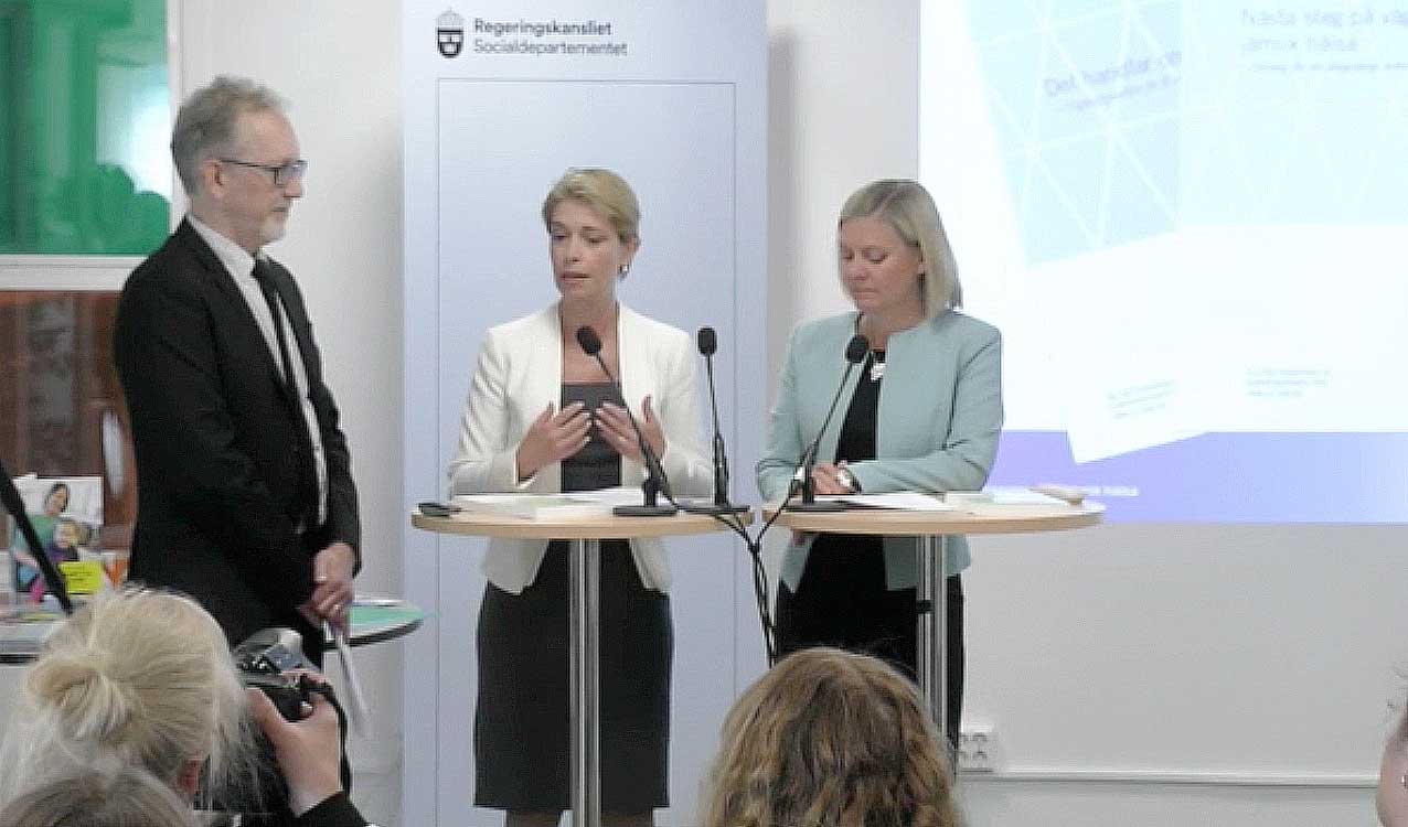 Under fredagen överlämnade Komissionen för jämlik hälsas ordförande Olle Lundberg (till vänster) slutbetänkandet till vikarierande sjukvårdsminister Annika Strandhäll (mitten) och finansminister Magdalena Andersson. Bild hämtad från regeringens webbsändning.