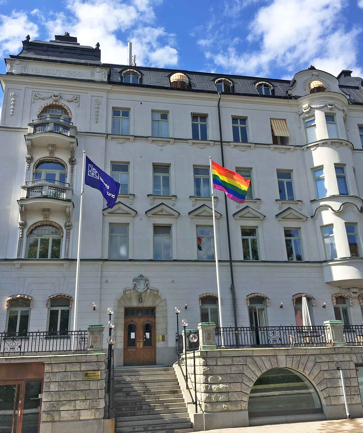 Framför Läkarförbundets fastighet i Stockholm vajar regnbågsflaggan för att uppmärksamma den pågående Pridefestivalen. Foto: Annica Lundbäck