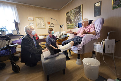 Geriatrikern Gabriel Ekman och sjuksköterskan Åsa Sjölin knackar på i villaområdet i utkanten av Norrtälje. Lalla Eriksson, 84, lider av svår hjärtsvikt och har fått hjälp av sjukhusets mobila vårdteam i sitt hem i över ett halvår, inledningsvis flera gånger i veckan. Numera har läget stabiliserats och det räcker med ett besök varannan vecka. I dag undersöker Gabriel Ekman hjärta och lungor med stetoskop och slår försiktigt med fingret på överkroppen för att lyssna efter vätska.