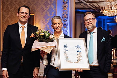 Bild från prisutdelningen: i mitten Johan Scheer, flankerad av Tobias Mogren och Fabian Mogren – sönerna till stiftelsens grundare och nuvarande styrelse i stiftelsen.