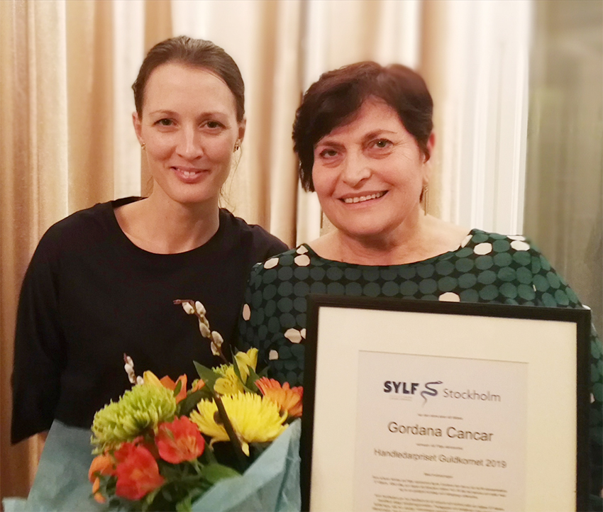 Gordana Cancar (t h), vinnare av årets Guldkornet tar emot priset av Sylf Stockholms ordförande Gabriella Schanning (t v). Foto: Kristin Arthur
